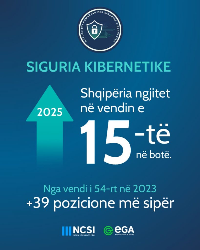 Shqipëria ka shënuar një arritje të jashtëzakonshme në fushën e sigurisë kibernetike, duke u renditur në vendin e 15-të në botë me 85.00 pikë, sipas National Cyber Security Index (NCSI).