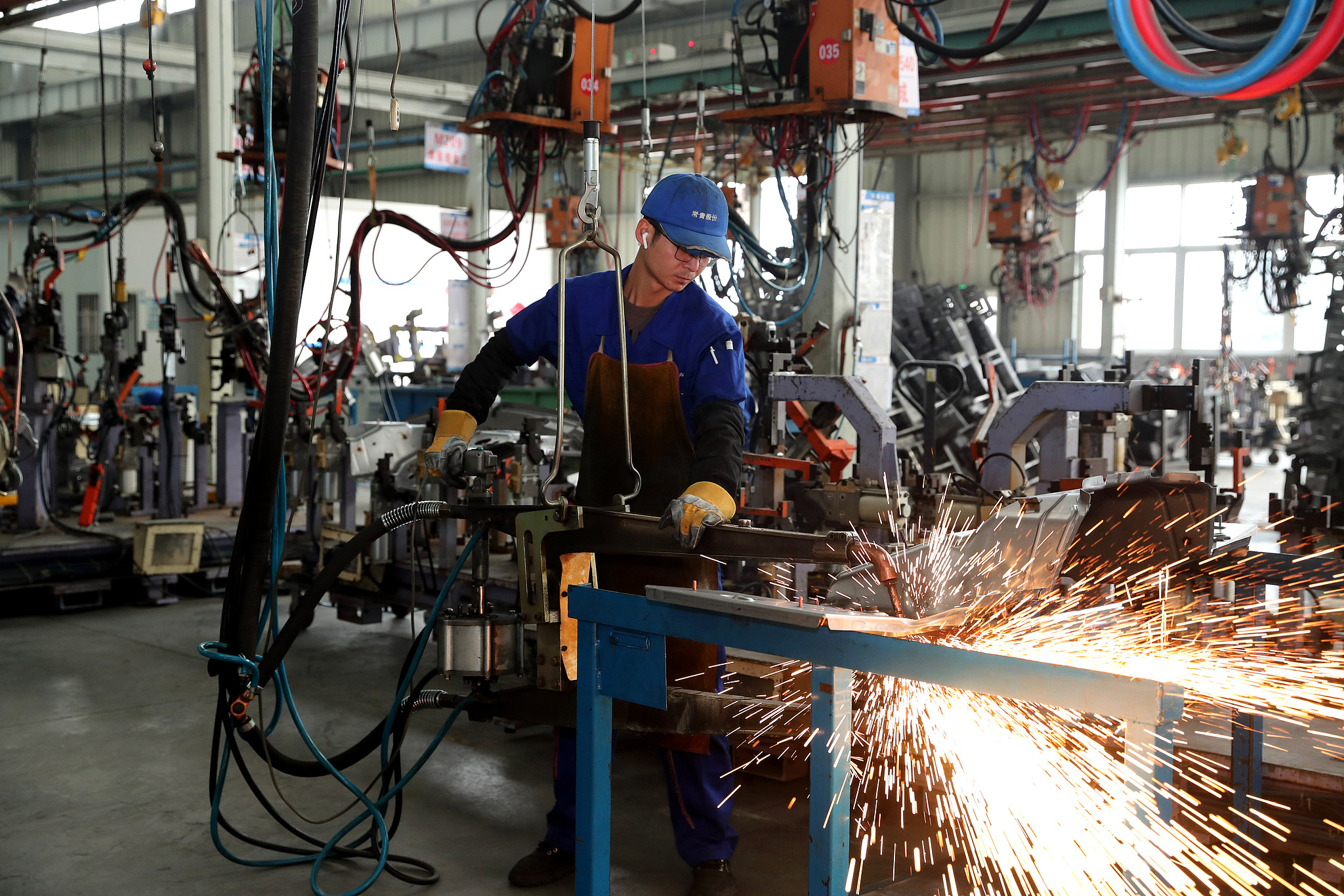 Në një fabrikë të prodhimit të pjesës së makinës, Punëtorët po saldojnë pjesë makinash./Foto nga VCG