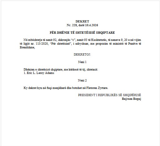 Vendimi është formalizuar përmes një dekreti të firmosur nga Presidenti i Republikës, Bajram Begaj.