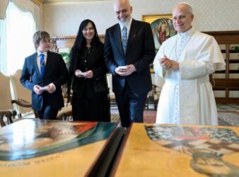 Kryeministri Edi Rama, i shoqëruar nga bashkëshortja e tij Linda Rama dhe djali i tyre Zaho, vizitoi Bazilikën e Zojës së Këshillit të Mirë “Regina di Albania”, në prag të takimit me Atin e Shenjtë.
